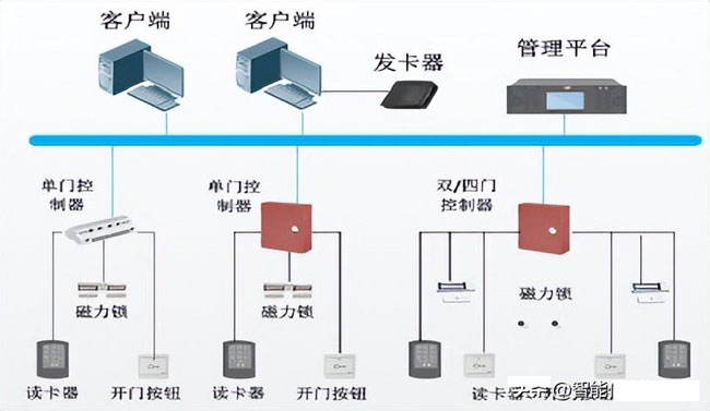 门禁系统主要有门禁软件和硬件组成。软件部分主要分为门禁控制终端软件和门禁管理终端软件。硬件部分主要包括了门禁控制器、读卡器、磁力锁等。