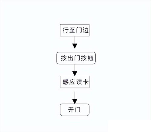 用户行至门边;读卡开门;操作完毕,门禁自动判断并存储本次开门记录,并发出开门信号;门自动打开;用户进门,门自动关闭